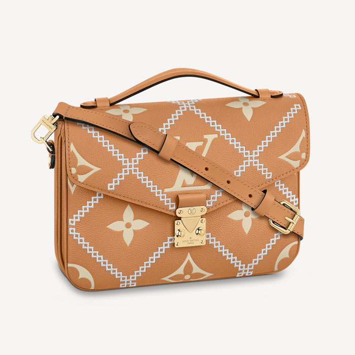 For Spring 2022 the Pochette Metis handbag in Monogram Empreinte leather is embellished with embroidery inspired by the quilted linings of original Louis Vuitton trunks. House craftsmanship shines in the colors and textures of the stitching against a background of embossed leather. This versatile statement piece features a convenient top handle and a removable cross-body strap.