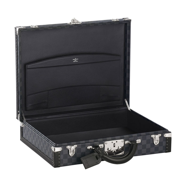 Featuring a secure lock, this damier graphite briefcase holds a laptop and several A4 documents. It comes with a comfortable leather handle and an address label.