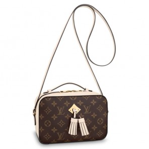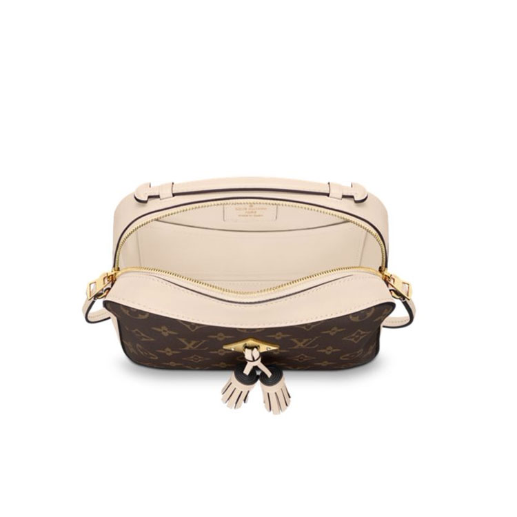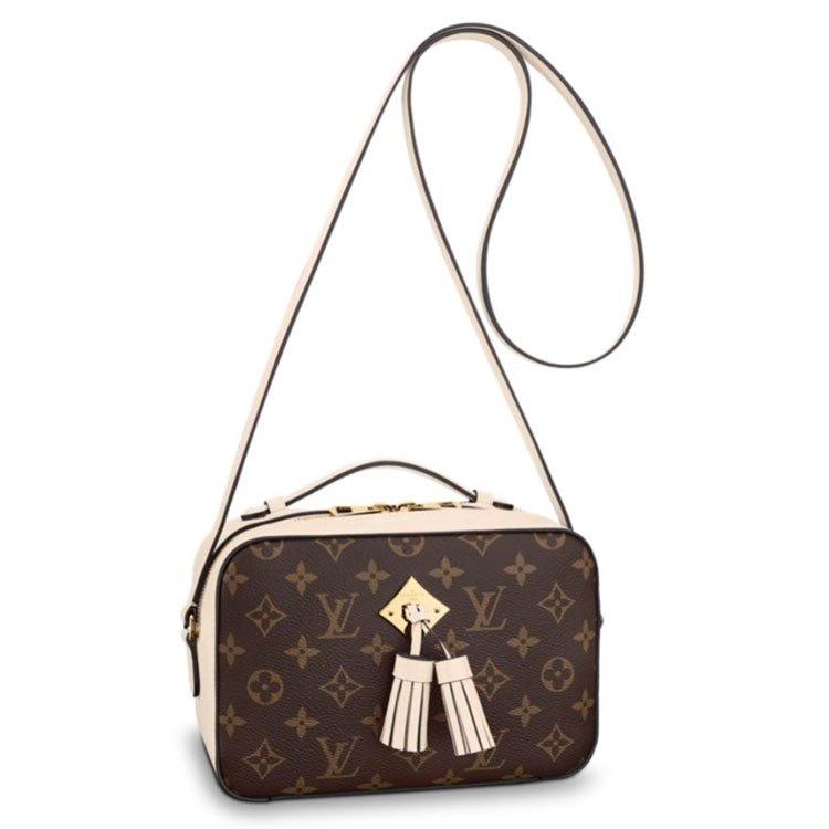 Monogram canvas and smooth calfskin combine in the Saintonge, a compact bag with a youthful vibe. The leather lends contrast and volume to the design, and the tassels are a playful touch. With its top handle and long strap, the bag can be styled in different ways.