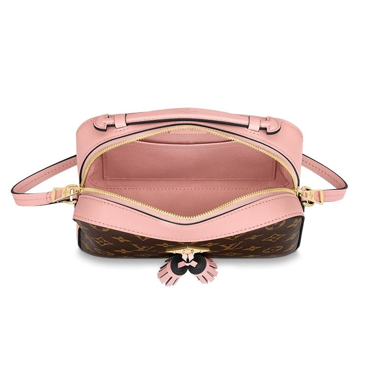 Monogram canvas and smooth calfskin combine in the Saintonge, a compact bag with a youthful vibe. The leather lends contrast and volume to the design, and the tassels are a playful touch. With its top handle and long strap, the bag can be styled in different ways.