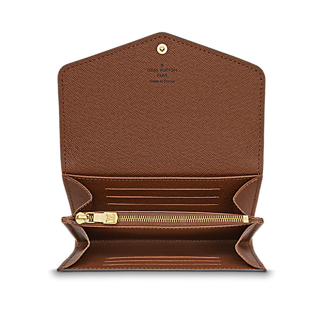 The stylish Sarah Compact Wallet in iconic Monogram canvas boasts all the functionalities of a long wallet in a compact size that fits easily into a small bag or clutch. The iconic envelope shape contains an ingeniously designed interior with a variety of pockets and credit card slots.