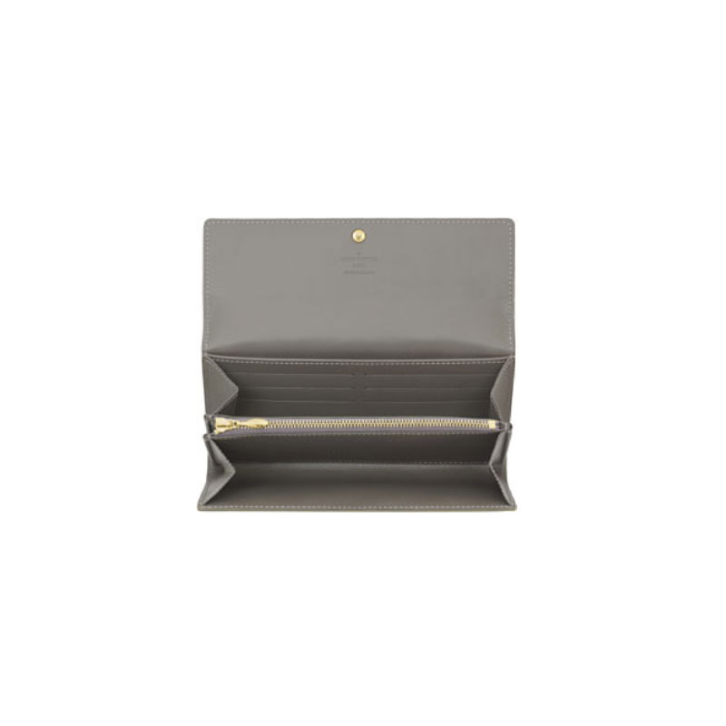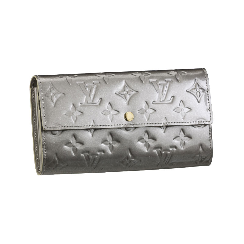 This wallet fashioned in discreetly embossed Monogram Vernis leather is feminine and compact. It features a press stud closure and is designed to hold bills and credit cards.