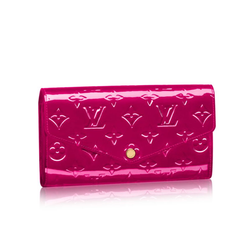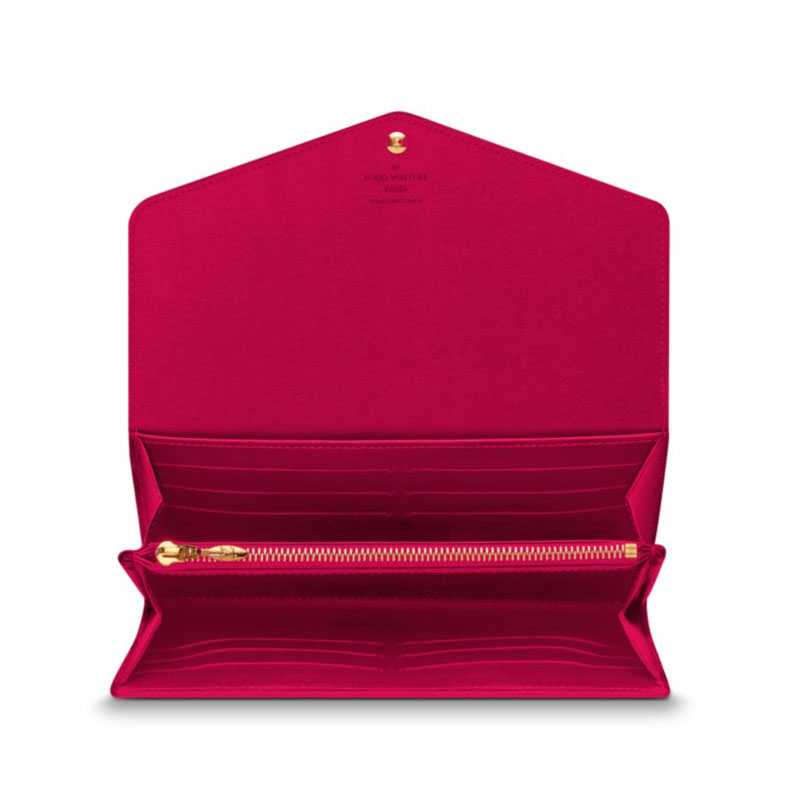 This envelope-style Sarah wallet combines an exterior in discreetly embossed Monogram Vernis leather with an ingeniously designed interior featuring a variety of pockets and credit card slots.