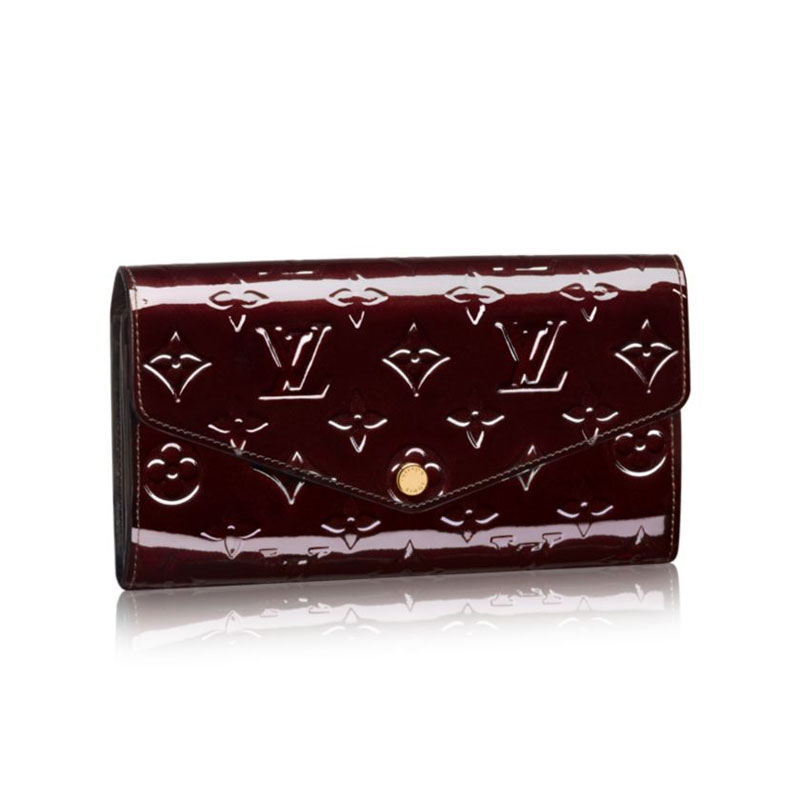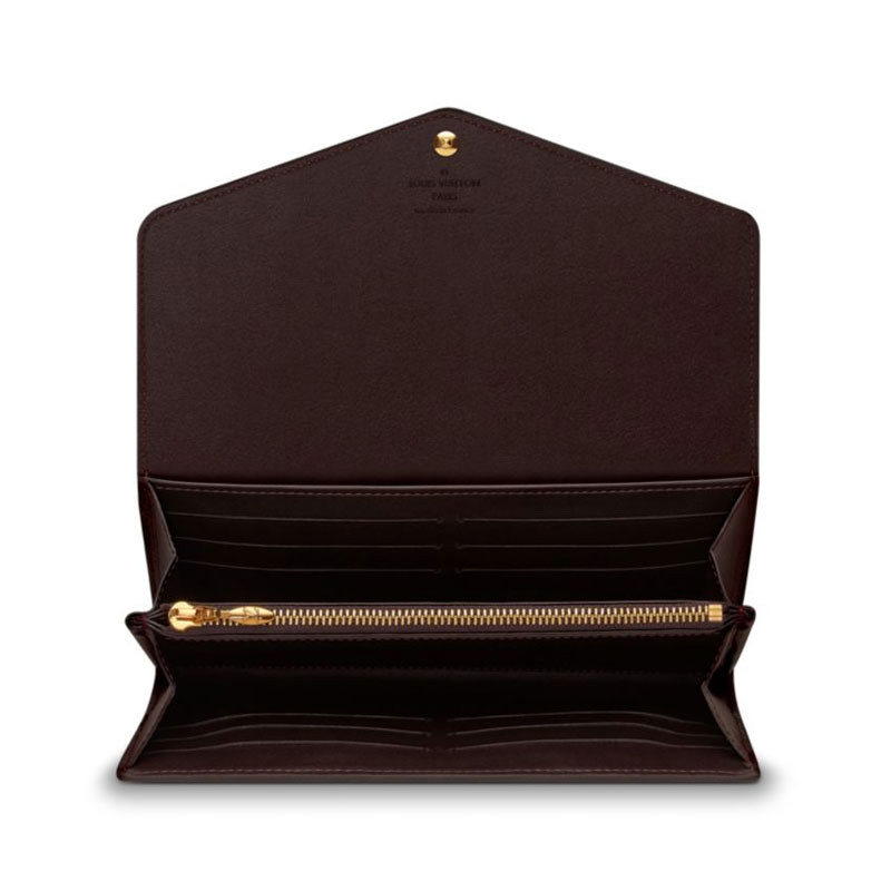 This envelope-style Sarah wallet combines an exterior in discreetly embossed Monogram Vernis leather with an ingeniously designed interior featuring a variety of pockets and credit card slots.