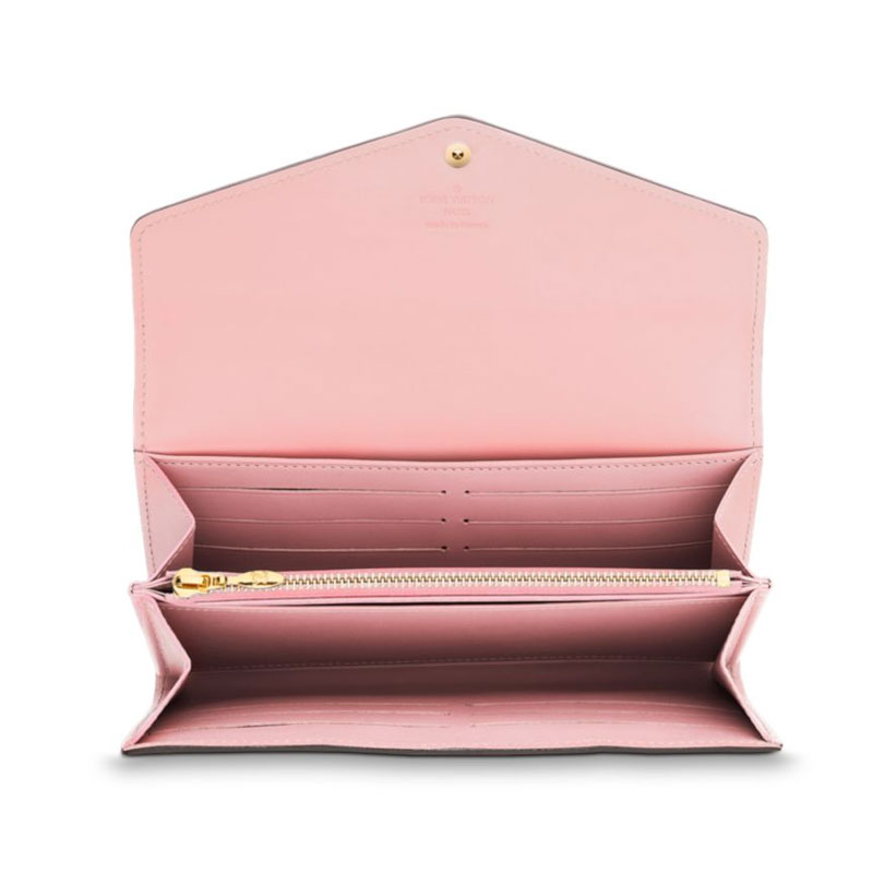 This envelope-style Sarah wallet combines an exterior in discreetly embossed Monogram Vernis leather with an ingeniously designed interior featuring a variety of pockets and credit card slots.