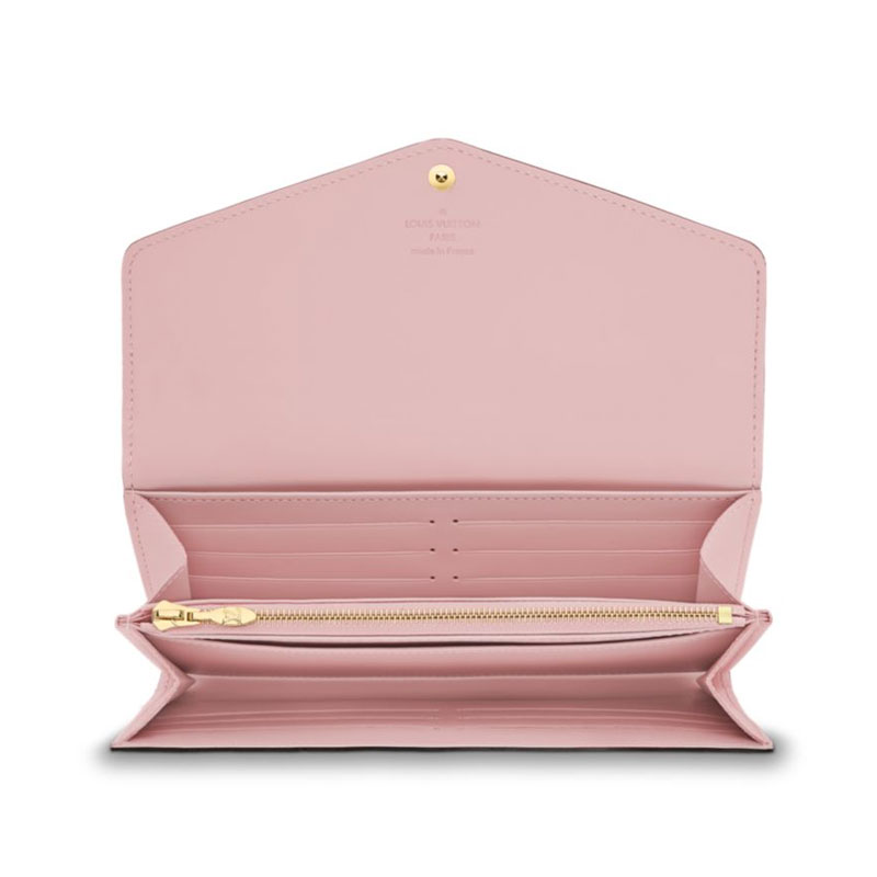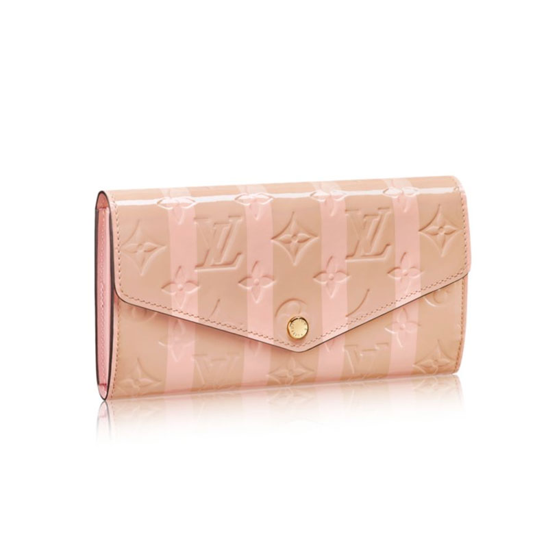 This envelope-style wallet with its playful striped exterior in embossed patent leather has an ingeniously designed interior featuring a variety of pockets and credit card slots.