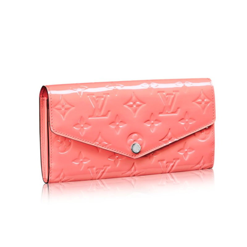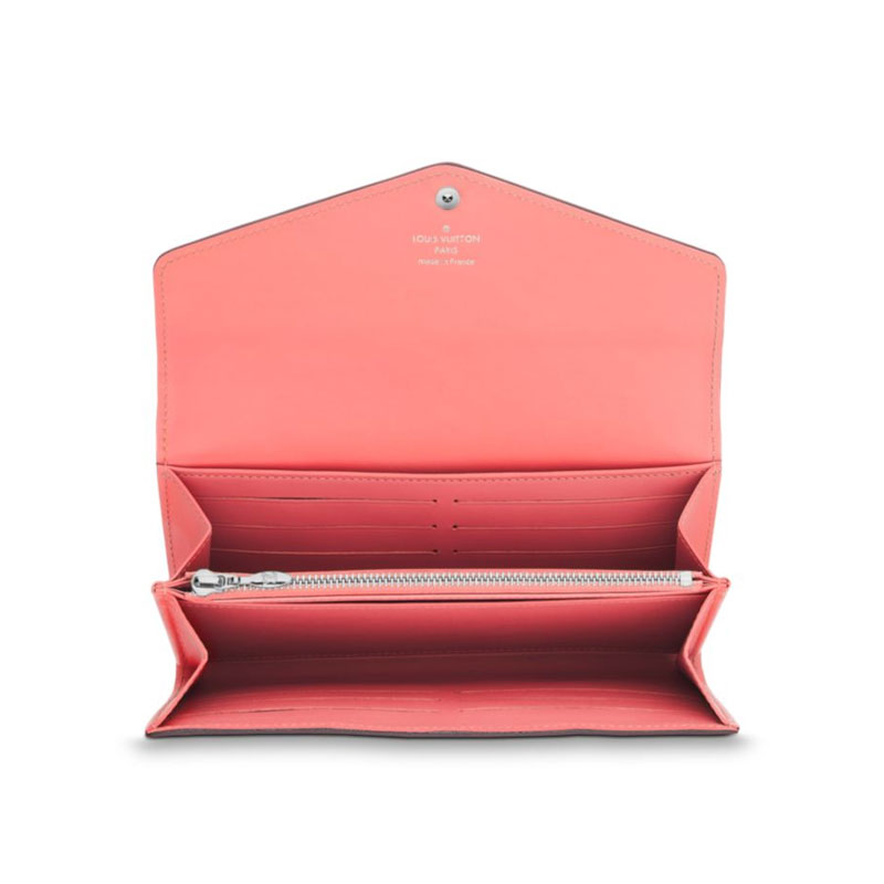 This envelope-style Sarah wallet combines an exterior in discreetly embossed Monogram Vernis leather with an ingeniously designed interior featuring a variety of pockets and credit card slots.