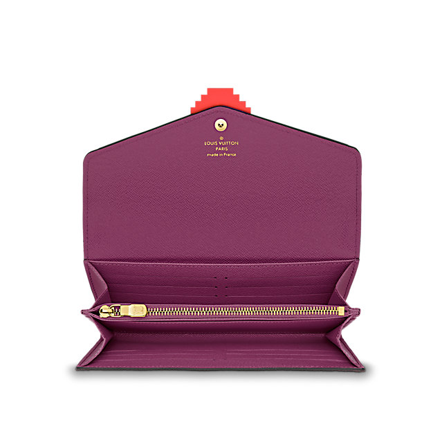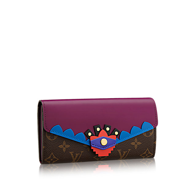 Playful and striking, the Monogram Totem theme pairs Louis Vuitton's iconic Monogram canvas with vibrant leather trim. The Sarah Totem Wallet in Monogram adorns the classic Sarah wallet whose ingenious design features a variety of pockets and credit card slots.