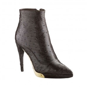In luxurious ostrich skin, these sophisticated ankle boots feature a sexy stiletto heel, a pointed toe and a striking golden-finish plaque engraved with the Louis Vuitton signature.