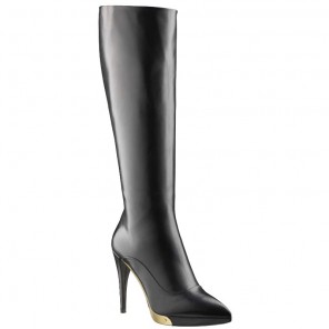 Super-sleek and ultra-modern, these glazed leather high boots feature a sexy stiletto heel, a pointed toe and a striking golden-finish plaque engraved with the Louis Vuitton signature.