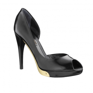 Super-sleek and ultra-modern, these glazed calf leather pumps feature a sexy stiletto heel, a peep toe and a striking golden-finish plaque engraved with the Louis Vuitton signature.