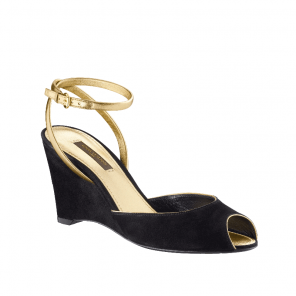 Designed by Sofia Coppola in collaboration with Louis Vuitton, this chic peep-toe wedge sandal in velvety suede edged with gold reflects Sofia Coppola's own classic elegance and day-to-evening style.