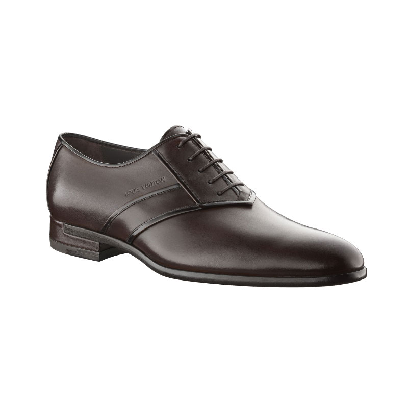 In subtly waxed calf leather, this modern business shoe is stylish and easy to wear. The graphic Louis Vuitton signature and leather-covered heel are refined details.