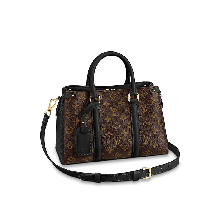 The fashionably petite Soufflot BB is crafted from supple Monogram canvas, with gussets and trim of rich, colored leather and a coordinating colored lining. With its vertical bands and name tag, it nods to the Keepall, a House icon. Refined and timeless, it can be carried cross-body, on the shoulder, by hand, or in the crook of the arm.