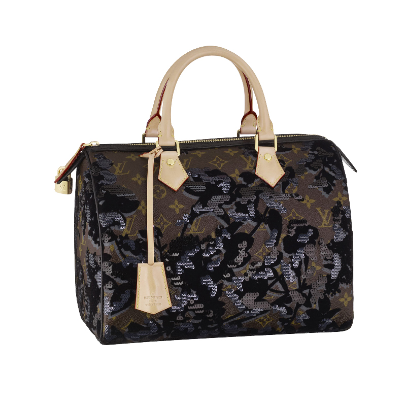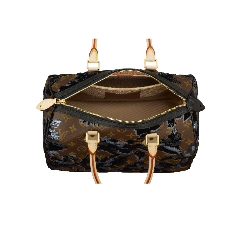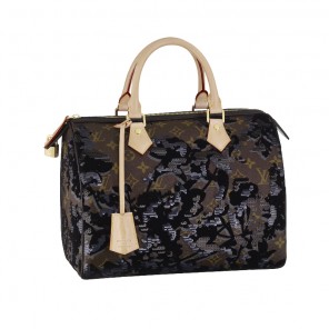 Ornate Monogram Fleur de Jais gives the iconic Speedy a bold edge. An elaborate floral pattern, glimmering sequins and sumptuous calfskin leather give this classic bag a sophisticated twist.
