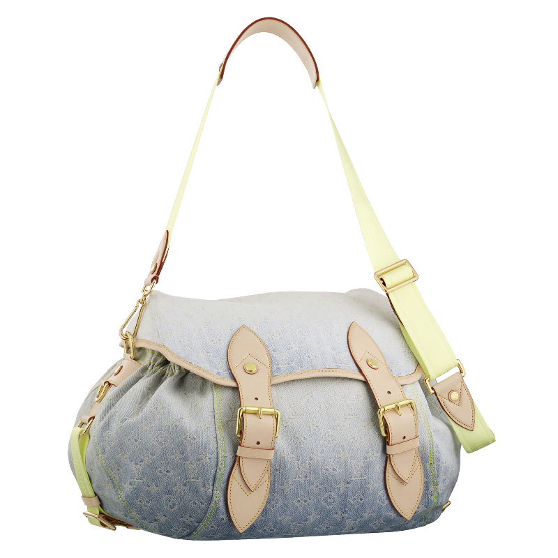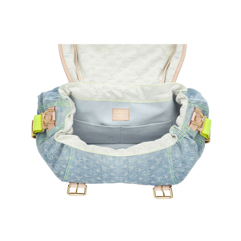 The Sunrise captures the intensity of bold natural colours. The vivid shades of the Monogram Denim are accentuated by sumptuous natural cowhide leather trimmings and an ultra-urban hands-free carry.