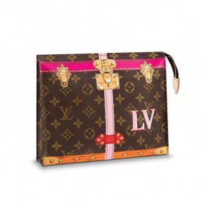 A chic travel companion, the Toiletry Pouch in iconic Monogram canvas offers a roomy interior, wide opening and washable lining. This collectible edition is printed with brightly colored trompe-l'?il details inspired by Louis Vuitton's historic trunks as part of the Trunk Summer 2018 theme encompassing shoes, accessories and leather goods.