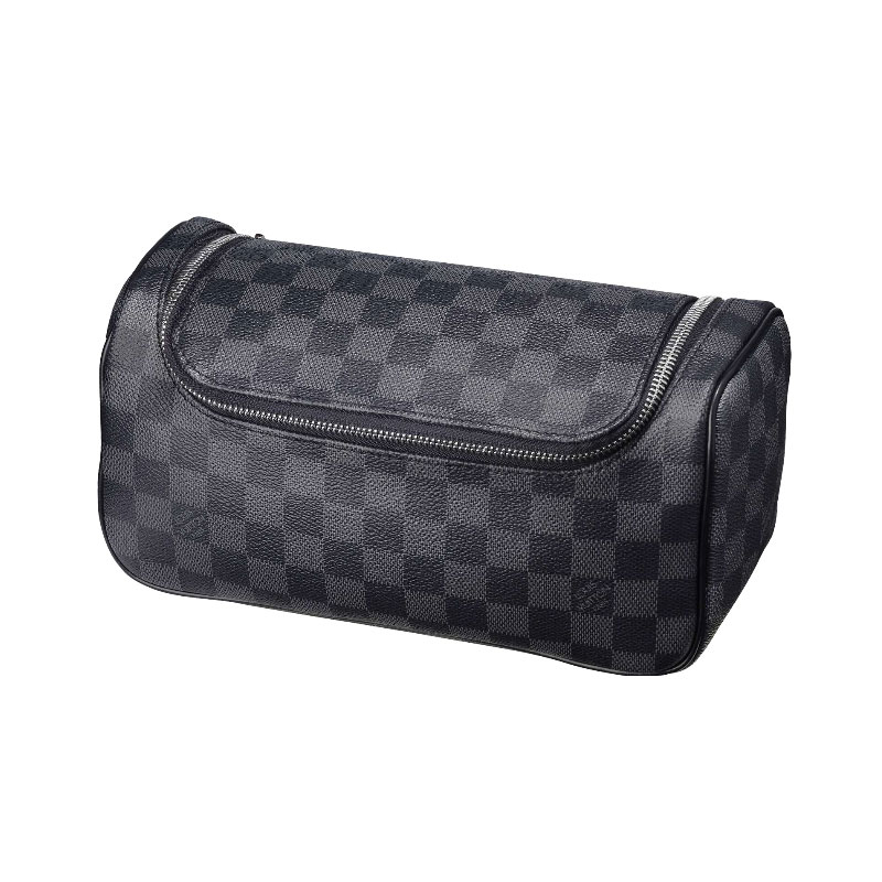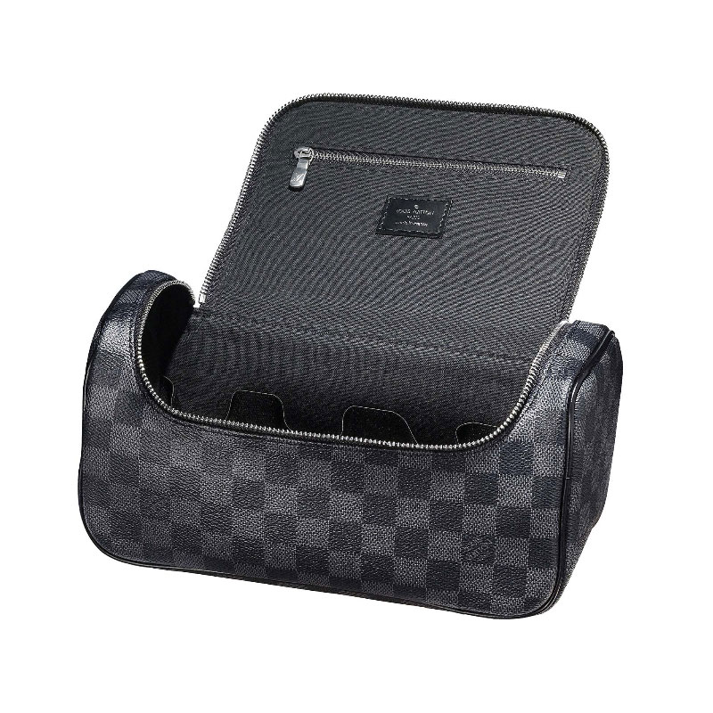 This is a very masculine Toilet pouch made from Damier Graphite canvas. The practical elastic attachments inside will keep bottles vertical.