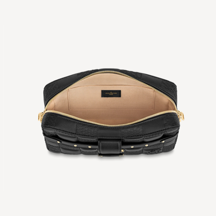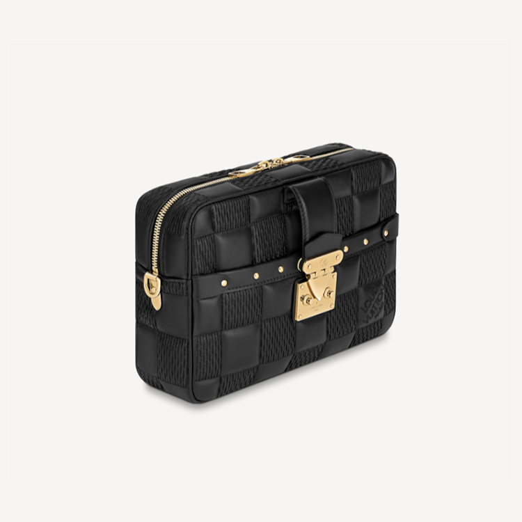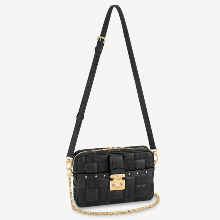 Inspired by the Trocadero camera bag from the House archives, the Troca MM handbag is made from Damier Quilt, a padded lambskin embroidered with an oversized Damier pattern. The bag square shape is finished with a gold-color S-lock, as well as studded trim and corners. There a removable shoulder chain in addition to the adjustable leather strap.