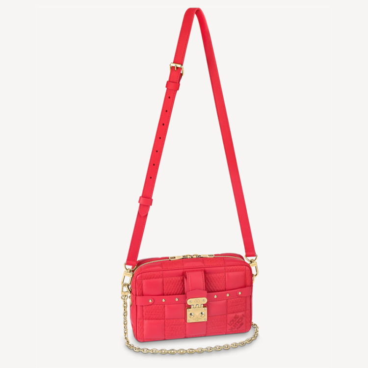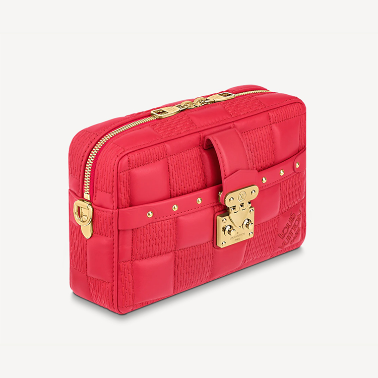 Designed for day-to-evening use, the small Troca PM handbag is made from Damier Quilt, padded lambskin with a large checkerboard Damier pattern. Compact and supple, this bag is body friendly when worn cross-body and casually stylish when carried by hand. Its squarish shape is perfectly complemented by the gold-color S-lock.