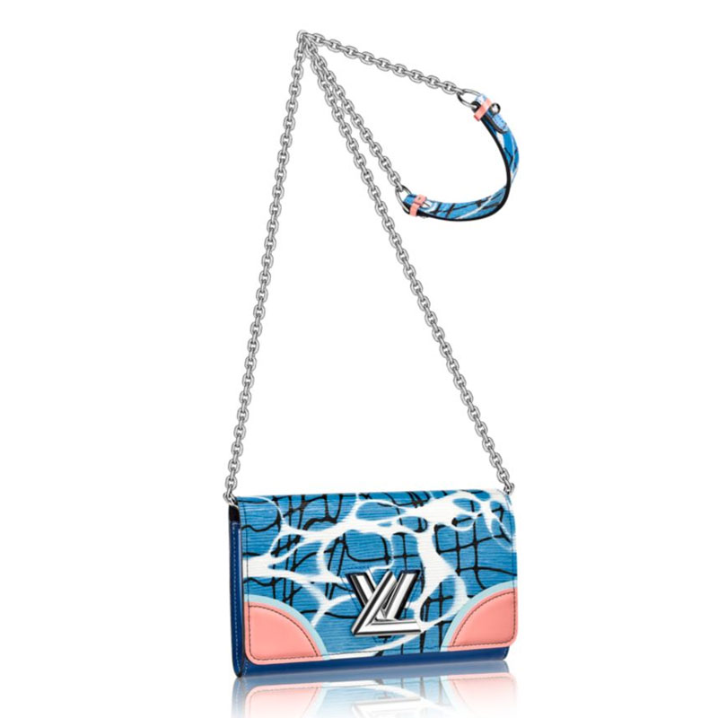 Capturing the spirit of summer, the striking Aqua pattern, seen at Louis Vuitton's Cruise 2016 show, was inspired by light playing on the surface of a swimming pool. It adorns the Twist chain wallet in printed Epi leather, which can also be worn as an elegant evening bag, either cross-body or over the shoulder. The playful Twist turn-lock features an L that transforms into a V with a twist of the fingers.