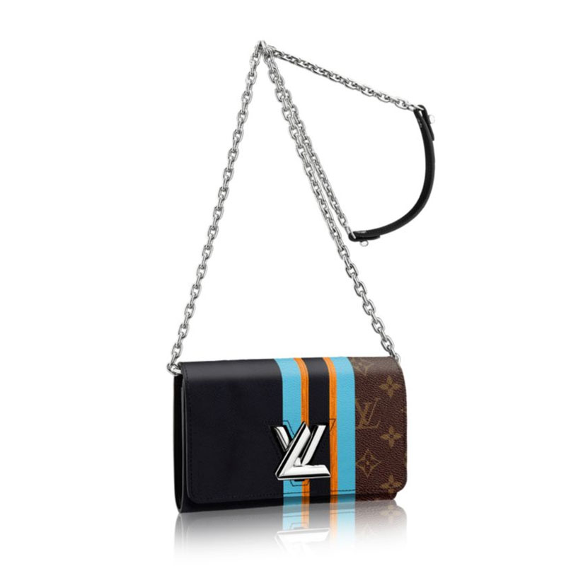 Stylish and versatile, the Twist Chain Wallet can be carried separately or using its practical silver chain. This bold design was inspired by the "heroine jackets" seen at the Spring-Summer 2016 fashion show, and also recalls historic personalized Louis Vuitton trunks