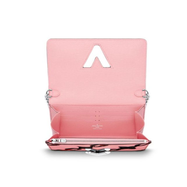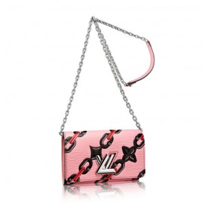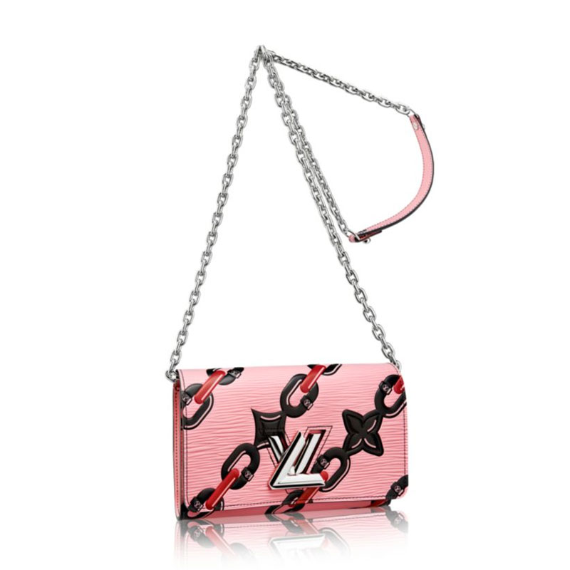 The chain print, incorporating Louis Vuitton's Monogram flowers, was a key theme of the Spring/Summer 2016 fashion show. It adorns the Twist chain wallet in Epi leather, which can also be worn as a shoulder or cross-body bag. The playful Twist turn-lock features an L that transforms into a V with a twist of the fingers.