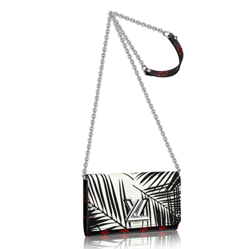 Seen at Louis Vuitton's Cruise 2016 show, the Monogram Palm theme combines iconic Monogram canvas with an exotic palm-tree print inspired by California. It adorns the Twist chain wallet in printed Epi leather, which can also be worn as an elegant evening bag, either cross-body or over the shoulder. The playful Twist turn-lock features an L that transforms into a V with a twist of the fingers.