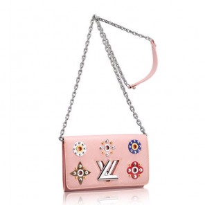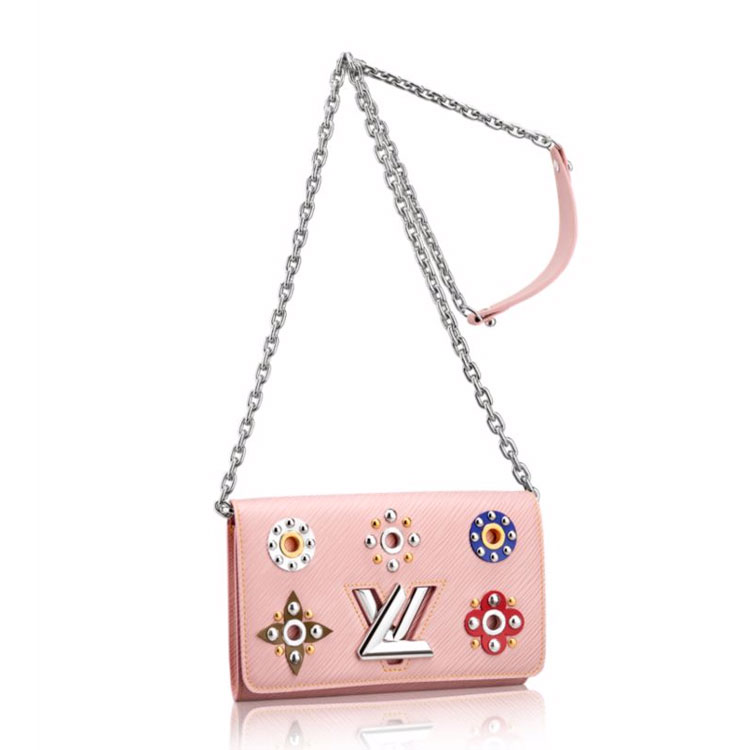 Stylish and versatile, the Twist Chain Wallet can be carried like a clutch or over the shoulder thanks to its gorgeous silver chain. Accessorized with delicate flowery leather patches perforated with eyelets and decorated with silver studs, this exceptional version brings a fashionable touch to any outfit. As always, it is accessorized with the playful Twist turn-lock, featuring an L that transforms into a V with a twist of the fingers.
