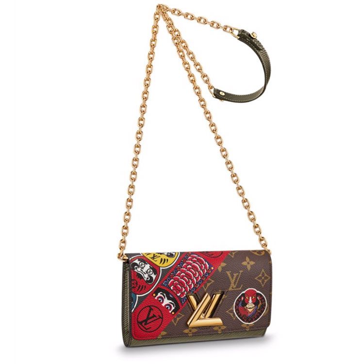Inspired by Kansa? Yamamoto, Nicolas Ghesquiere brings Kabuki stickers to this Twist Chain Wallet in Monogram canvas. As versatile as it is stylish, it can be carried as a clutch or over the shoulder on its long chain.