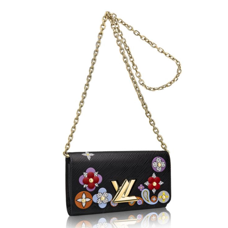 This Twist Chain Wallet combines vibrant colors with crafted leather patches to create a fresh, and very feminine, interpretation of the emblematic Monogram flower.