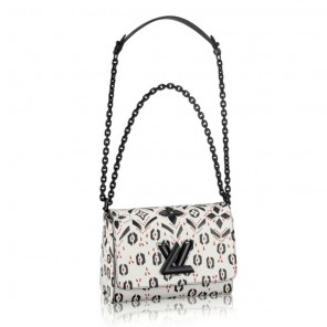 This eye-catching Twist bag features a signature pattern from Nicolas Ghesquiere's F/W 15 runway, also visible on ready-to-wear looks. Vuitton craftsmen transposed the Graphic print to embossed and embroidered leather, for a handsomely crafted piece with major fashion credentials. The exclusive LV twist lock, shoulder chain and hardware are wrought of matte-black metal, new this season. An ideal bag for every day, the cleverly designed “wave” bottom makes the Twist surprisingly capacious.