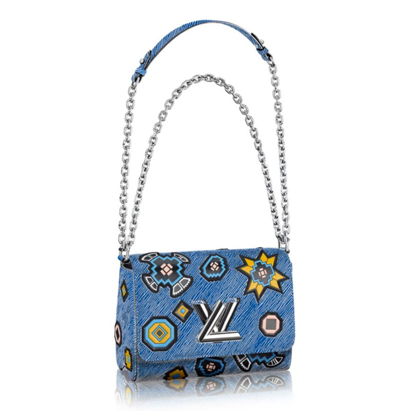 Swinging from the shoulder or worn cross-body on its long convertible chain, this new Twist bag makes a fashion-forward statement. On a background of light blue or white Epi Denim leather, colourful ethnic patterns sound an ethnic note that's pitch-perfect with Nicolas Ghesquiere's latest ready-to-wear looks. The skills of House ateliers are on display as well, in the exceptional leather workmanship and the impeccably crafted LV twist lock. Though small in scale, the bag鈥檚 unique 鈥渨ave鈥 bottom makes it unexpectedly roomy.