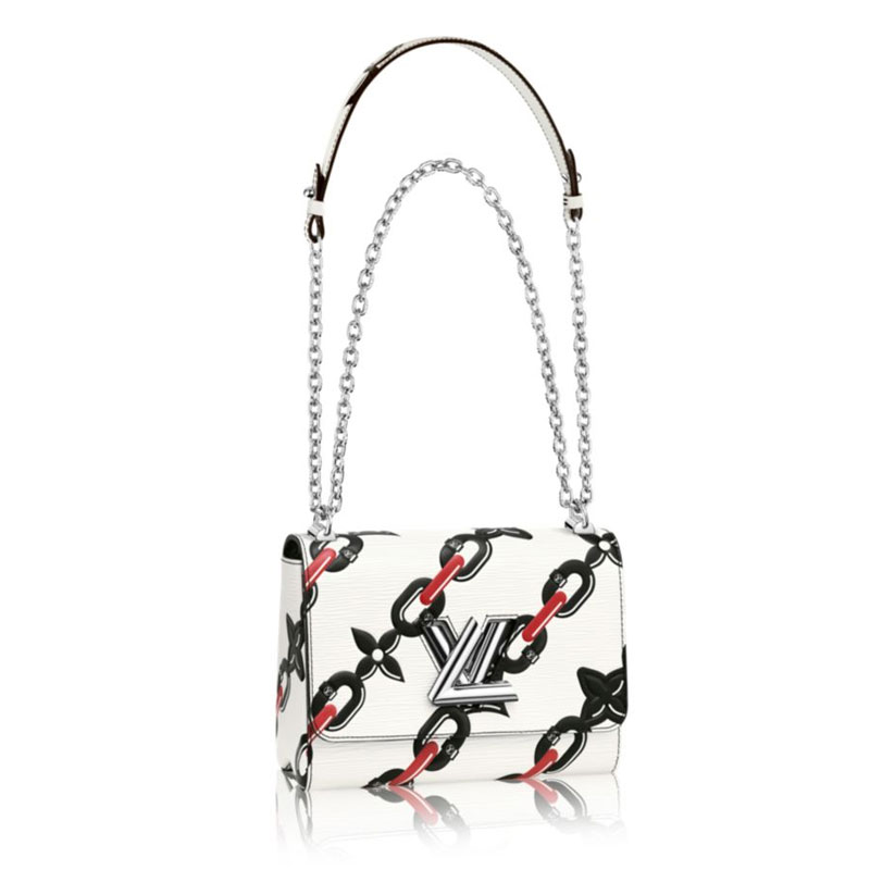This bold oversized Chain Flower print, intricately mixing New Classics signature chain and iconic Monogram Flowers, is embossed on the Epi leather. The Twist Epi Chain Flower MM is instantly recognizable from the Spring-Summer 2016 show. This New Classic is unexpectedly roomy and practical thanks to its wave base and convertible shoulder chain.