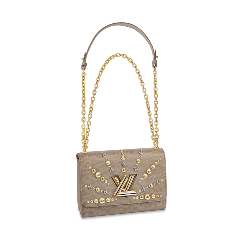 This refined Twist MM chain bag is embellished with a sunburst of engraved and flower shaped gold- and silver-tone studs, a nod to the colossal Sun sculpture that adorns the House flagship on Place Vendome in Paris. Crafted from Epi leather, this precious piece is an ultimate touch of elegance for evening ensembles.