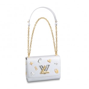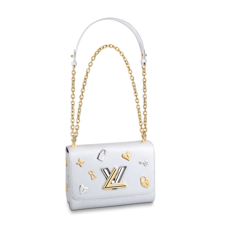 As part of the LV Love Lock collection, the iconic Twist MM handbag in grained Epi leather is studded with silver and gold-tone ornaments representing locks, keys and Monogram Flowers. One of Louis Vuitton's most recognizable designs, the Twist is distinguished by its wave-shaped base, transforming LV twist-lock and long, sliding chain.