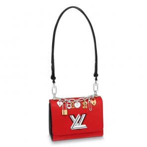 The Twist PM LV Love Lock Charms handbag comes in red Epi leather ornamented with a removable chain hung with charms in silver and gold-color metal. The tiny locks, keys and other motifs bring a rock feel to this neatly proportioned bag, whose long leather strap offers two carry options.