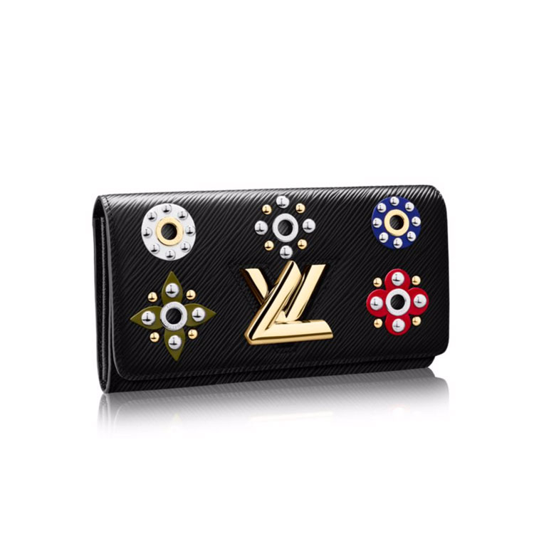 The iconic Twist Wallet gets a fresh touch thanks to the application of delicate flowery leather patches perforated with eyelets and decorated with silver studs. As always, it is accessorized with the playful Twist turn-lock, featuring an L that transforms into a V with a twist of the fingers.