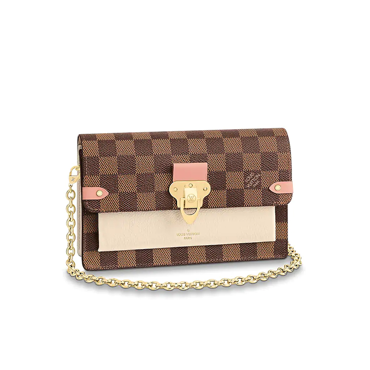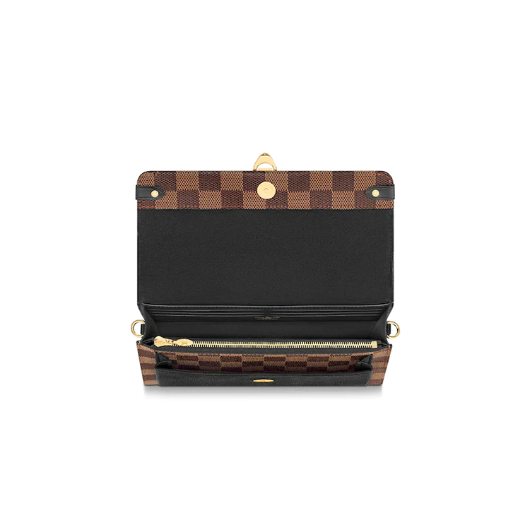 The Vavin chain wallet combines Louis Vuitton's iconic Damier canvas with colored leather in a smart design that works for day and evening. Its flap, secured with a clasp inspired by the historic trunks, conceals a front pocket which is ideal for a smartphone. Its removable chain enables it to be carried in several different ways.