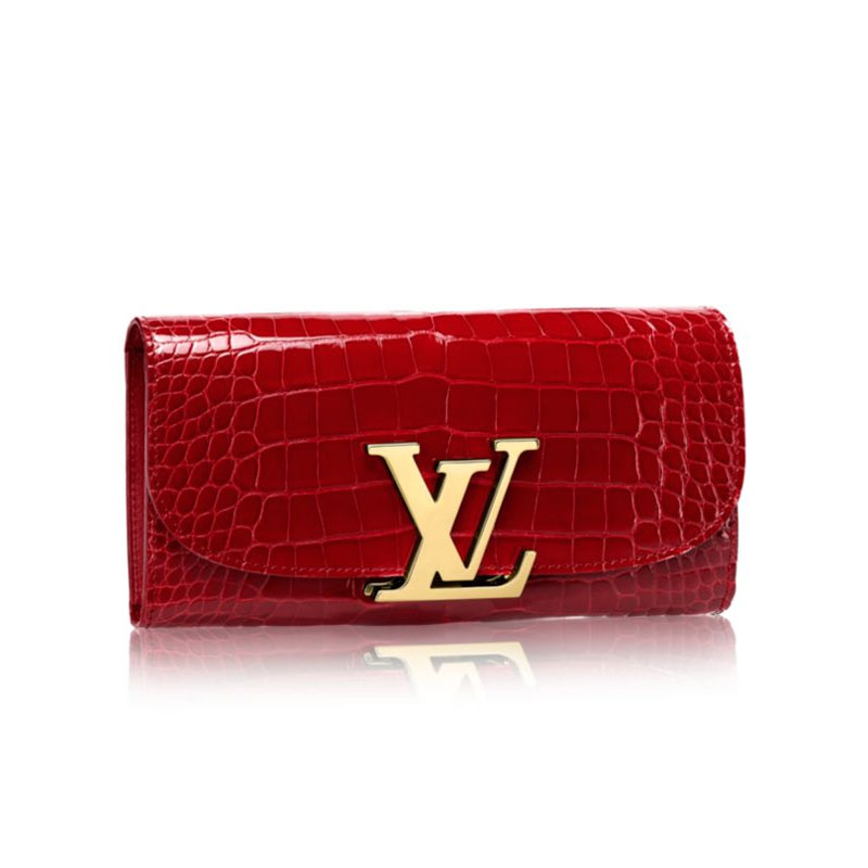 Timelessly elegant in precious shiny alligator skin, the Vivienne LV long wallet with its distinctive LV initials clasp can also double up as an evening clutch. Its well-designed interior contains an array of pockets and credit card slots, as well as a removable pouch with a zippered pocket for coins.