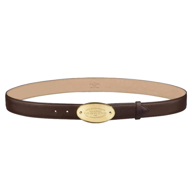 This casual chic belt in finest natural calf leather is accessorized with a striking oval buckle inspired by a lock patented by Louis Vuitton in 1890.