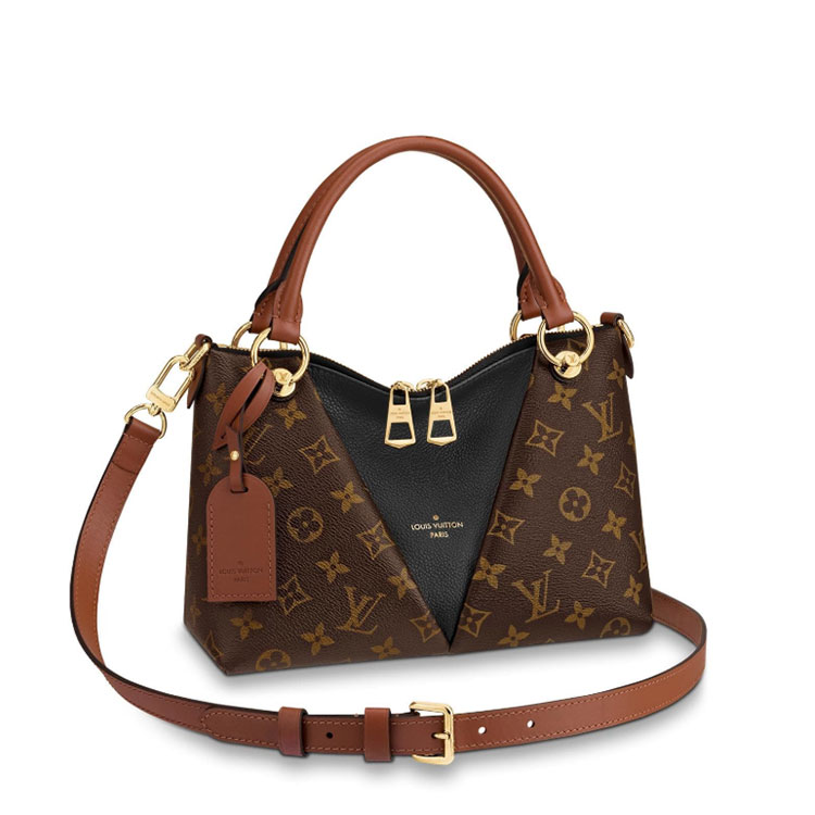 Inspired by the "V" of Vuitton, the V Tote handbag is fashioned from Monogram canvas with a large triangular panel in grained leather. It is accessorized with gold-color hardware and a leather nametag and can be carried as a handbag or over the shoulder thanks to its removable strap.