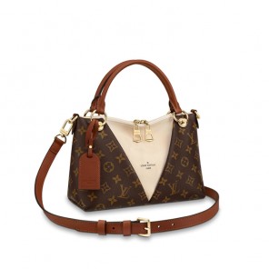 Inspired by the "V" of Vuitton, the V Tote handbag is fashioned from Monogram canvas with a large triangular panel in grained leather. It is accessorized with gold-color hardware and a leather nametag and can be carried as a handbag or over the shoulder thanks to its removable strap.
