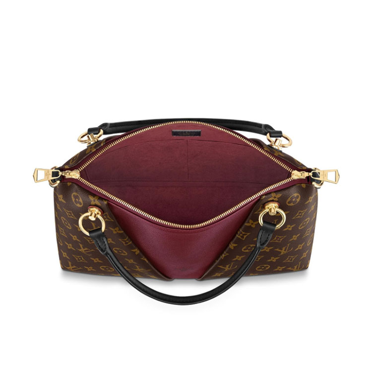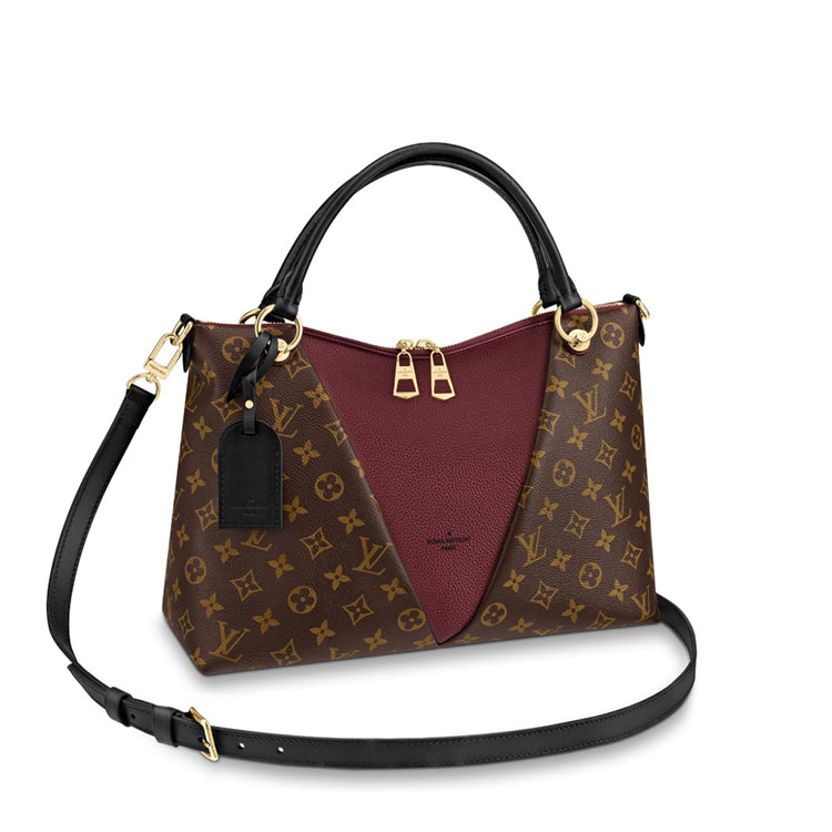 For Fall-Winter 2018, Monogram canvas is combined with grained leather in the V Tote MM handbag. It features a front panel of cowhide leather in a V shape, evocative of the initial of Vuitton, that hides a zipped front pocket. The gold-tone hardware and LV engraved handle-mount rings add shine to this elegant and functional bag.
