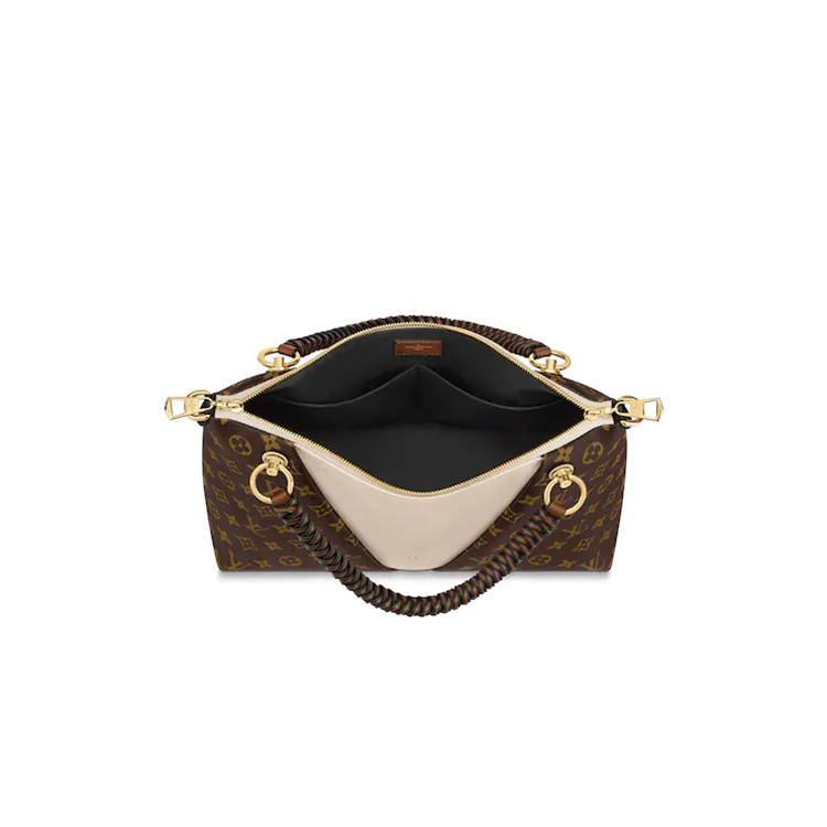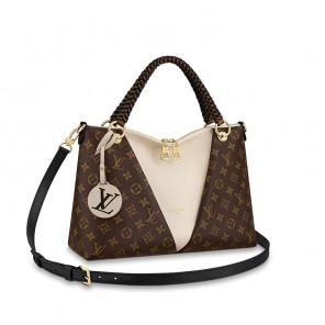 Fashioned from classic Monogram coated canvas with two eye-catching top handles in finely braided leather and a cream-color V panel in smooth cowhide leather, the roomy V Tote bag is an elegant everyday solution. Casual yet chic, it features gold-color hardware and a glamorous oversized LV charm.