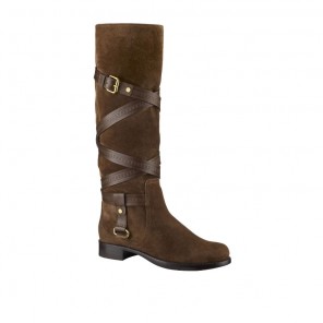 Interpreted in soft, lightweight suede, these high boots look edgy when paired with light summer dresses. They feature embossed leather straps inspired by the losine edging of Louis Vuitton trunks.