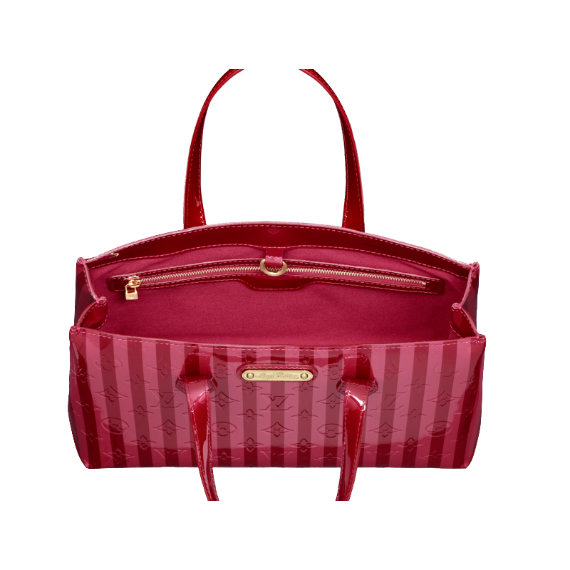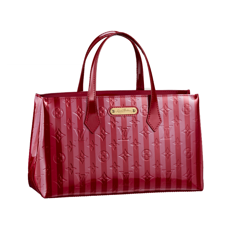 Carry the entials in true Louis Vuitton style with the wilshire PM. The heritage-inspired stripcs of glamorous monogram vernis Rayurcs are beautifully complemented by rich golden brass pricces.