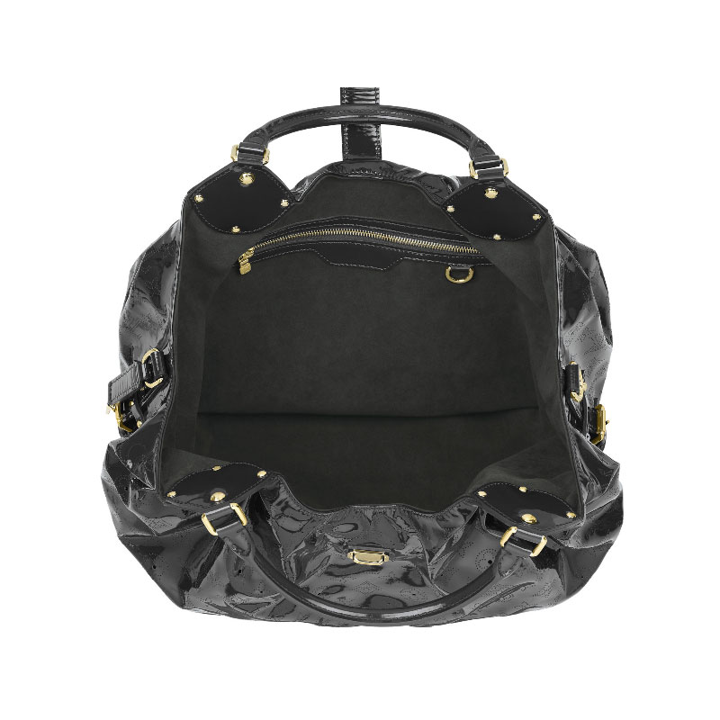 The Surya range is named after the Hindu Sun God because of its radiance. This XL bag, in supple, discreetly perforated Monogram patent leather, has sophisticated pleat work for body friendliness. The Surya leather is qualitative and lends itself to play with feminine details as well as an array of glossy and bright colors.