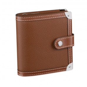 In Suhali leather, this compact wallet holds change and stamps in a zipped pocket and holds bills and cards in a separate compartment closed with a press stud.