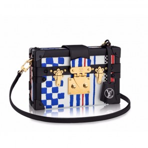The scene of the Louis Vuitton Cruise 2015 show – Monte Carlo – also hosts the Grand Prix motor race, a detail not lost on Creative Director Nicolas Ghesquière. He took a cue from racing colors, checks and stripes for this exclusive, exquisite Petite Malle. Wrapped in embossed lambskin leather, the tiny trunk is accented with aged-brass fittings and black calf-leather trim. The hinged lid opens to reveal a lining of soft, quilted lambskin. Designed to be worn cross-body or carried as a clutch – the leather strap is detachable.